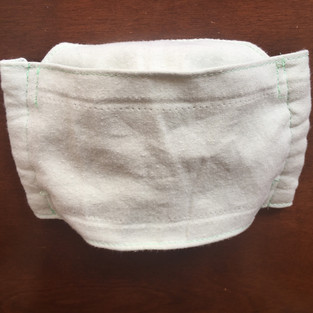 This mask is the standard mask that hospitals are requesting be made for them. It includes two layers of cotton, plus an additional pocket so filter material can be added. Not depicted in the prototype is an additional tube at the top so that a nose wire can be added. The non-cotton parts are removable so the mask can be repeatedly autoclaved. This mask is one size fits all.